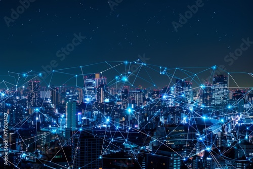 Fototapeta premium A city skyline at night with blue digital lines connecting buildings,...