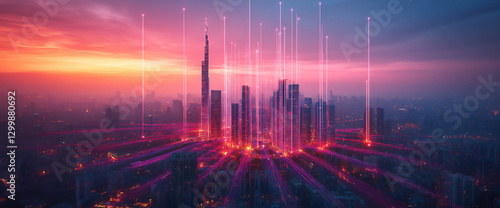 © Sung Hwan Kim, Naklejka premium a city skyline at night with glowing lines of data flowing between buildin