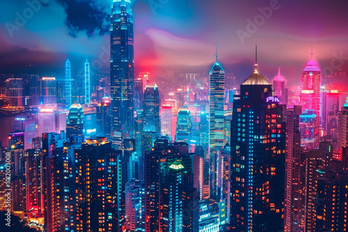 © Formoney, Fototapeta premium A city skyline at night with neon lights and a cloudy sky