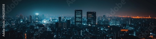 © Andrii Zastrozhnov, Fototapeta premium A city skyline at night with the lights of the buildings shining brightly. The city is bustling with activity and energy
