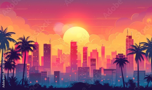 Fototapeta premium a city skyline at sunset, in the 80s style, retro warm colors Generative AI
