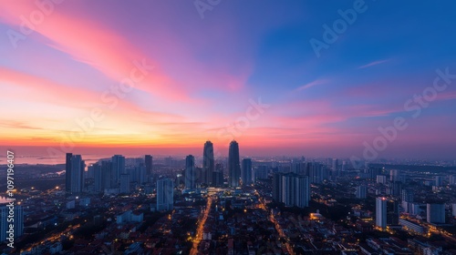 © AH TAR STOCK, Fototapeta premium A city skyline at sunset with a beautiful orange sky
