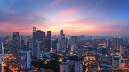 © Nathamanee, Fototapeta premium A city skyline at sunset with a beautiful orange sky