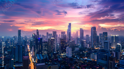 © ninenat, Obraz premium A city skyline at sunset with a purple sky