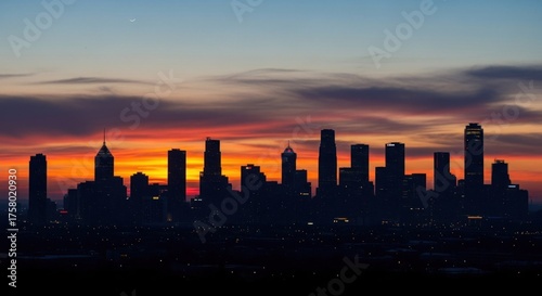 Naklejka premium A city skyline at sunset with a vibrant orange and pink sky, featuring silhouettes of tall buildings and a few clouds.