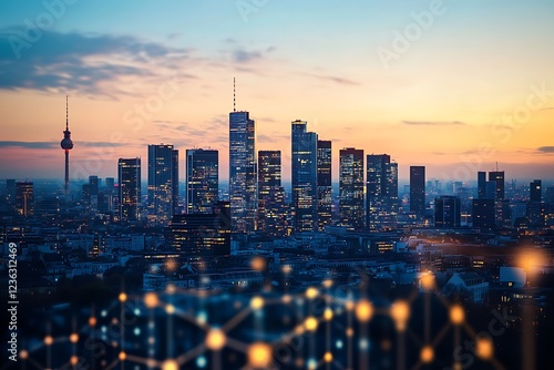© projek, Obraz premium A city skyline at sunset with illuminated buildings and a communication tower.