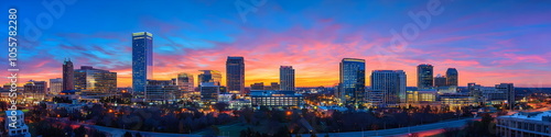 © SJarkCube, Obraz premium A city skyline at sunset with the sun setting behind the buildings