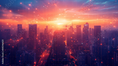 Fototapeta premium A city skyline at twilight with a visible digital network overlay, showcasing...