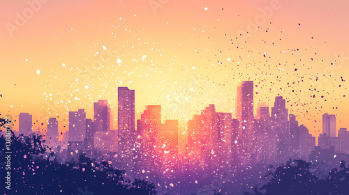 Fototapeta premium A city skyline dissolving into particles at sunrise, depicting change,...