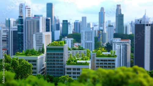 Obraz premium A city skyline featuring green-roofed buildings amidst a modern urban landscape, showcasing a blend of nature and architecture.