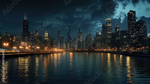 Obraz premium A City skyline illuminated at night, capturing fine textures and vivid realism
