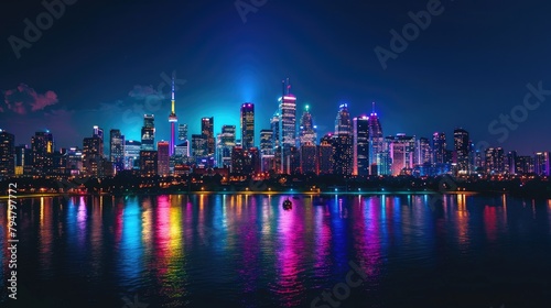 © Dara, Fototapeta premium A city skyline illuminated in rainbow colors to support Pride Month.
