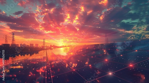© OZTOCOOL, Fototapeta premium A city skyline is reflected in the water as the sun sets