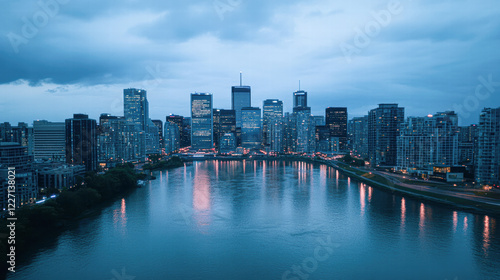 © Kowit, Obraz premium A city skyline is reflected in the water of a river