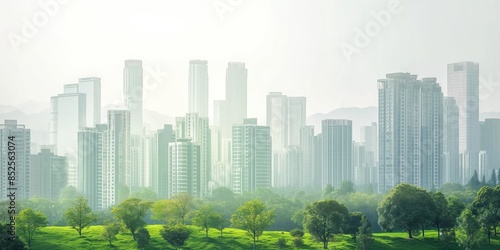 © Armin, Obraz premium A city skyline obscured by haze, blending urban architecture with atmospheric environmental issues