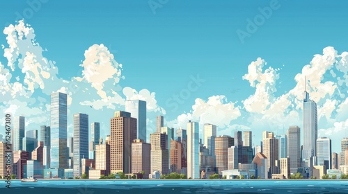 Naklejka premium A City Skyline on a Sunny Day with Fluffy Clouds