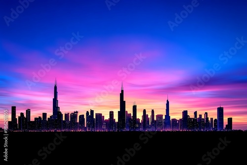 © Thanyarat, Fototapeta premium A city skyline silhouette at dusk, with soft pinks and purples fading into a deep blue sky