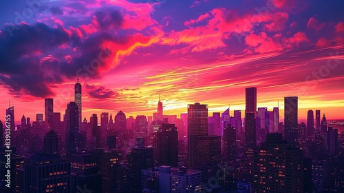 © ammar, Fototapeta premium A city skyline silhouetted against a vibrant sunset, with skyscrapers reaching up towards the painted sky.
