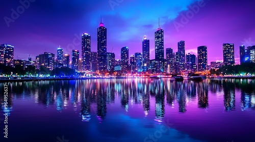 © Raitalinn, Fototapeta premium A city skyline sparkles in the night, mirrored perfectly in the calm waters below.