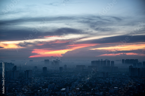 © Gabriel, Obraz premium A city skyline with a beautiful sunset in the background