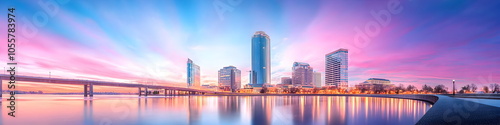 © SJarkCube, Naklejka premium A city skyline with a bridge in the foreground