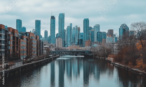 © Olha, Naklejka premium A city skyline with a bridge in the foreground