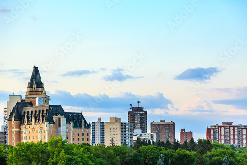© Scott Prokop, Naklejka premium A city skyline with a large building in the middle