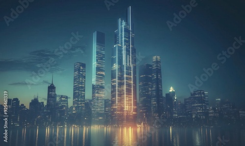 © panumas, Fototapeta premium A city skyline with a large building in the middle