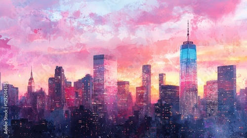 © Babb, Obraz premium A city skyline with a pink and blue sky