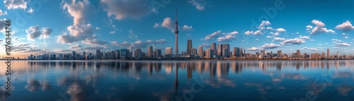 © SH Design, Obraz premium A city skyline with a river running through it