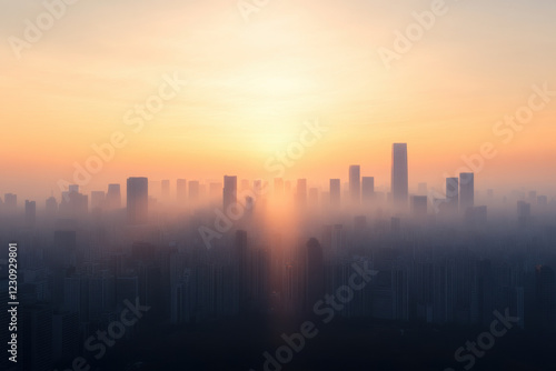 © jr-art, Fototapeta premium A city skyline with a sun setting in the background
