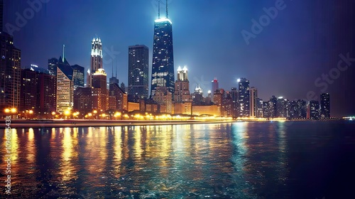Obraz premium A city skyline with bright lights from skyscrapers during the nighttime.