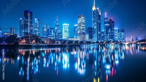 © Plaifah, Fototapeta premium A city skyline with illuminated skyscrapers reflecting in a calm river at night.