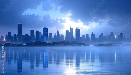© KarpenArt Studio, Fototapeta premium A city skyline with skyscrapers and buildings at dusk reflected on calm water.