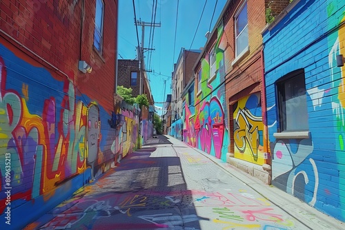 © Vit, Fototapeta premium A city street adorned with an array of colorful graffiti art covering the walls, transforming the alleyway into an eye-catching and captivating urban scenery.