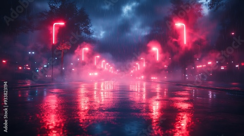 © Helois, Fototapeta premium A city street at night with neon lights reflecting in puddles of rain.