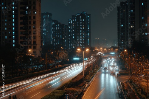Fototapeta premium A city street at night, with tall buildings and lights in the background The road is filled with cars moving fast Generative AI