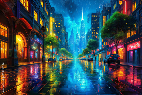 Naklejka premium A city street at night, with tall buildings lining the sides of the road and colorful lights illuminating the scene. The street is wet from recent rainfall, reflecting glows on its surface.