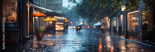 Fototapeta premium A city street bathed in the soft glow of streetlights, as rain falls and...