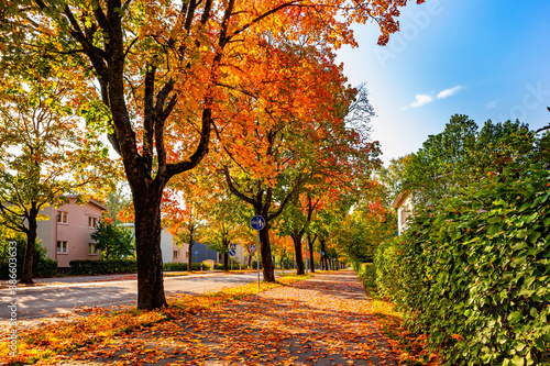 Naklejka premium A city street in autumn season. Colorful trees. A road covered with falling leaves in town. Helsinki street scene. Comfortable and ecological urban city concept. Fall colors. Walking and bicycle path.
