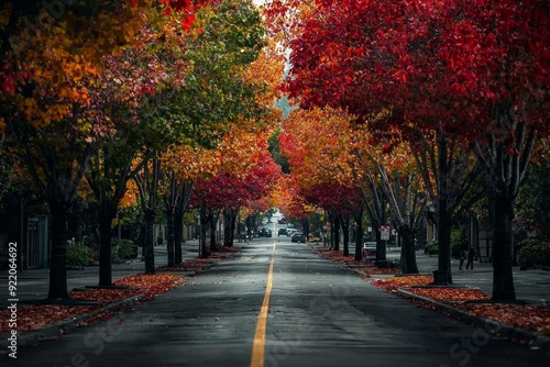 © grey, Naklejka premium A city street lined with trees, their leaves changing colors in a gradient from green to red.