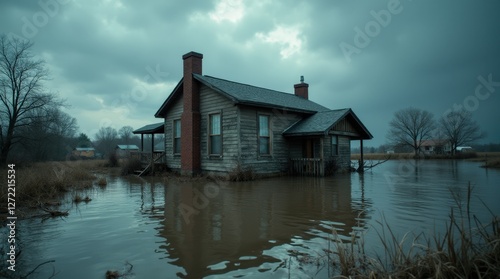 © K1drock, Fototapeta premium a city street submerged in floodwaters, with cars partially submerged and debris floating, illustrating the impact of severe flooding.