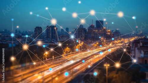 © jiraphat, Naklejka premium A city street with a network of lights and a lot of cars. The lights are connected to each other and to the cars