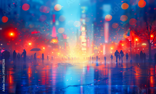 © Vadim, Obraz premium A city street with people walking and a few umbrellas. The street is wet and the lights are on