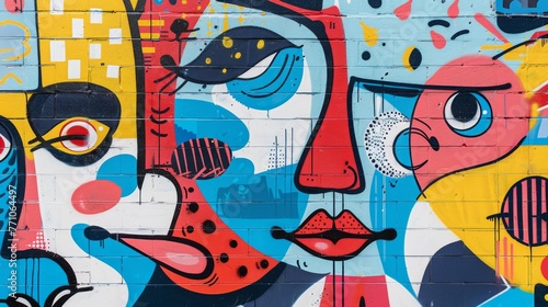 © Nawarit, Fototapeta premium A city wall comes alive with a vibrant and abstract street art mural, showcasing a collage of cartoon-like faces.
