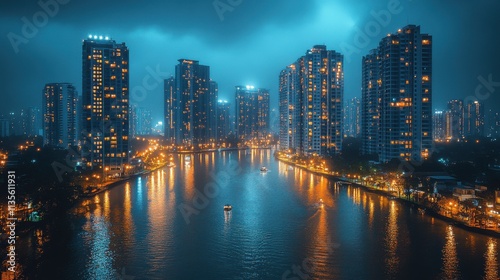 © NhV, Obraz premium a city with lights and a reflection of a body of water