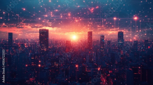 Fototapeta premium A Cityscape at Dusk with an Interconnected Network of Red Lights