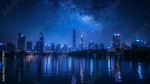 Fototapeta premium A cityscape at night, the city illuminated by thousands of lights, a bustling...