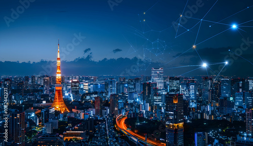 Obraz premium A cityscape at night with glowing lines of digital connections linking...