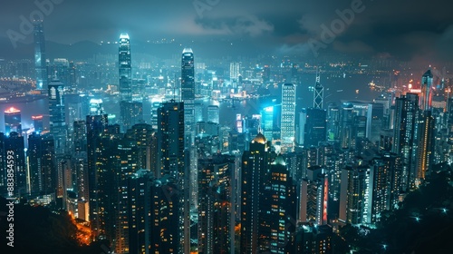 © toomi123, Obraz premium A cityscape at night, with skyscrapers illuminated against a dark sky